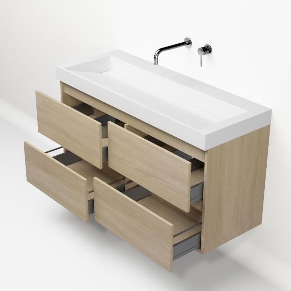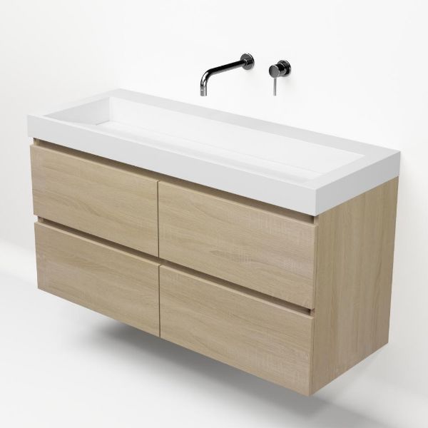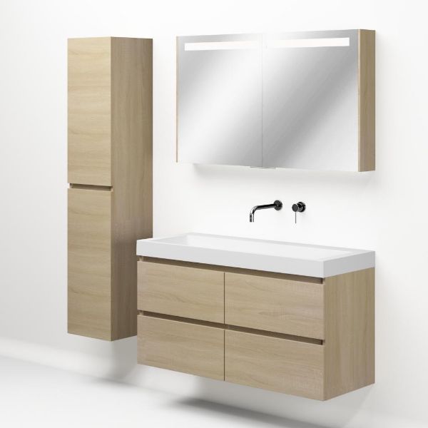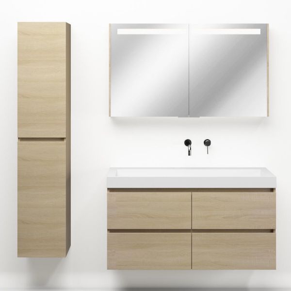 Greeploos badkamermeubel in de kleur eiken licht is 120 cm breed. De wastafel is vervaardig in polystone en heeft de kleur wit. Dit badkamermeubel met deze wastafel is leverbaar tussen de 60 cm t/m 200 cm