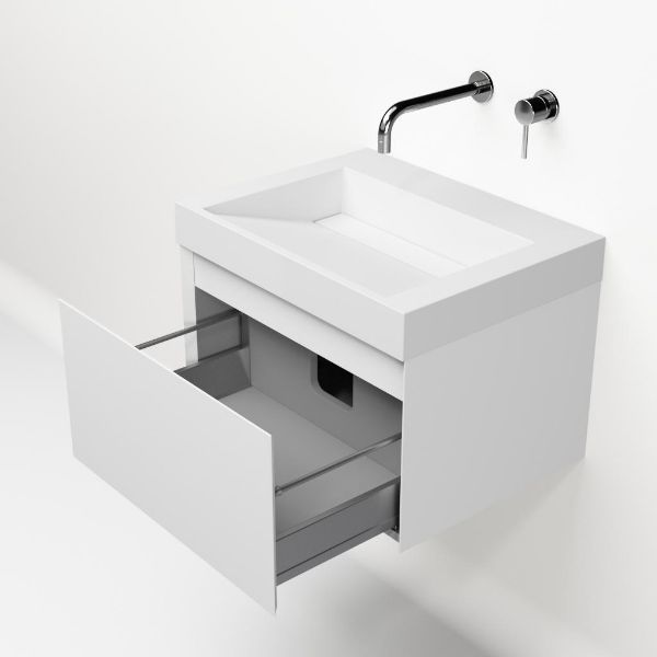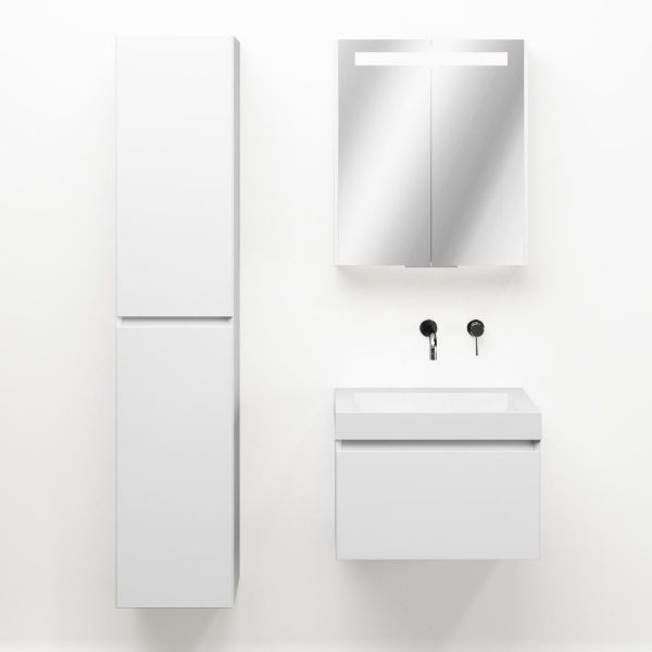 Greeploos badkamermeubel in de kleur wit mat is 60 cm breed. De wastafel is vervaardig in polystone en heeft de kleur wit. Dit badkamermeubel met deze wastafel is leverbaar tussen de 60 cm t/m 160 cm