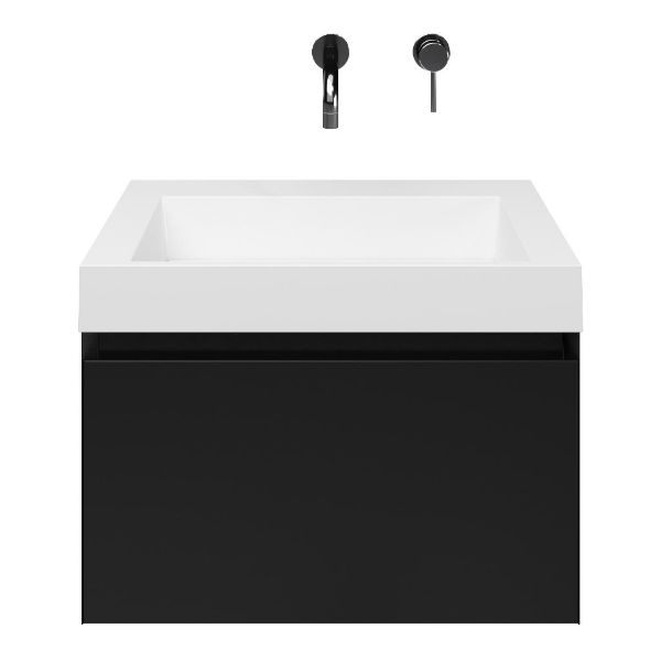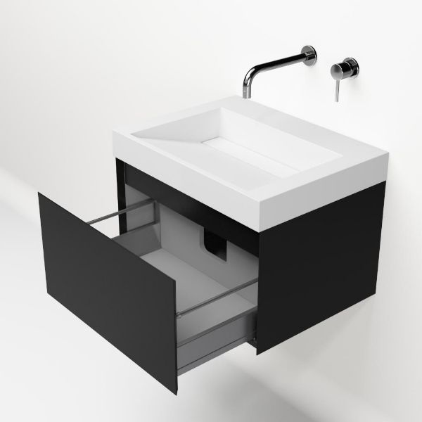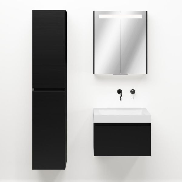 Greeploos badkamermeubel in de kleur zwart mat is 60 cm breed. De wastafel is vervaardig in polystone en heeft de kleur wit. Dit badkamermeubel met deze wastafel is leverbaar tussen de 60 cm t/m 160 cm