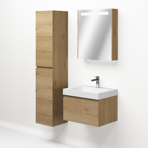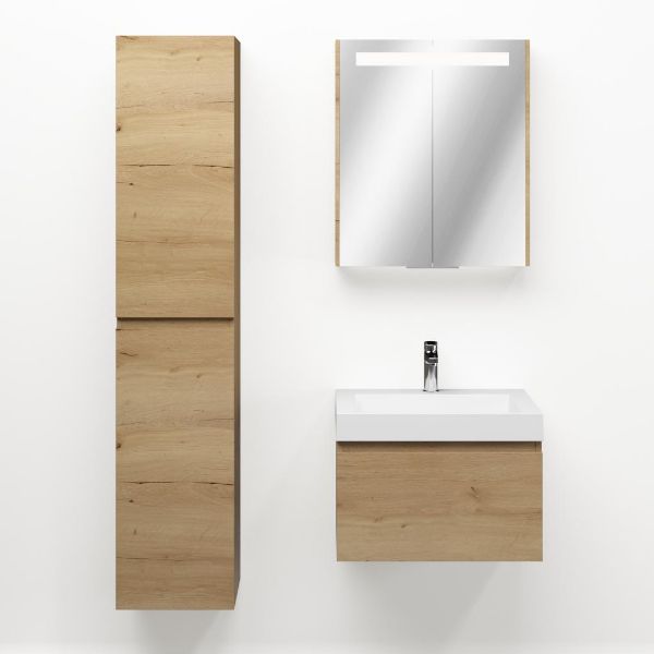 Greeploos badkamermeubel in de kleur eiken natuur is 60 cm breed. De wastafel is vervaardig in polystone en heeft de kleur wit. Dit badkamermeubel met deze wastafel is leverbaar tussen de 60 cm t/m 160 cm