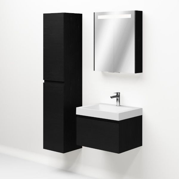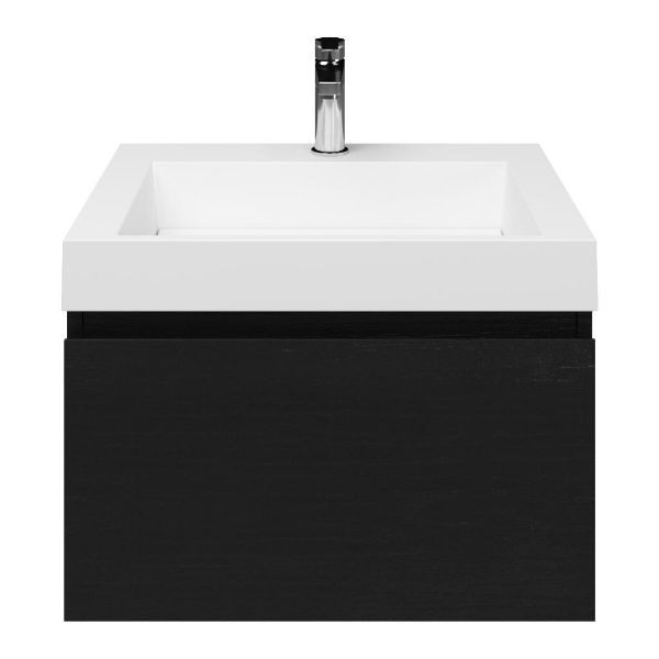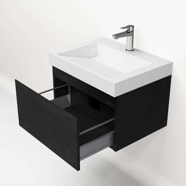 Greeploos badkamermeubel in de kleur zwart mat eiken is 60 cm breed. De wastafel is vervaardig in polystone en heeft de kleur wit. Dit badkamermeubel met deze wastafel is leverbaar tussen de 60 cm t/m 160 cm