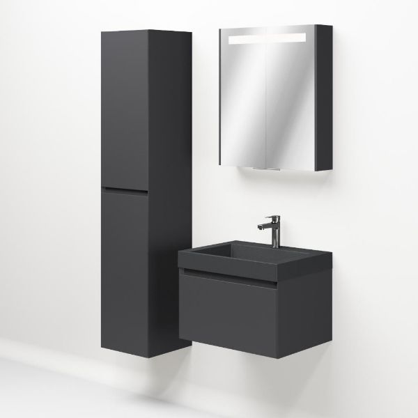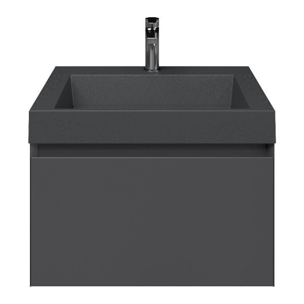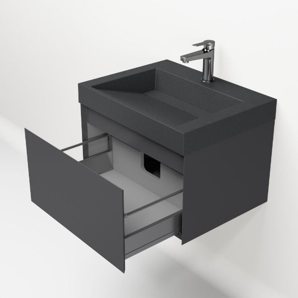 Greeploos badkamermeubel in de kleur antraciet mat is 60 cm breed. De wastafel is vervaardig in quartz en heeft de kleur grijs mat quartz. Dit badkamermeubel met deze wastafel is leverbaar tussen de 60 cm t/m 160 cm