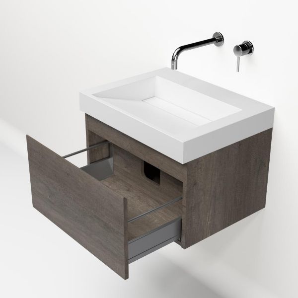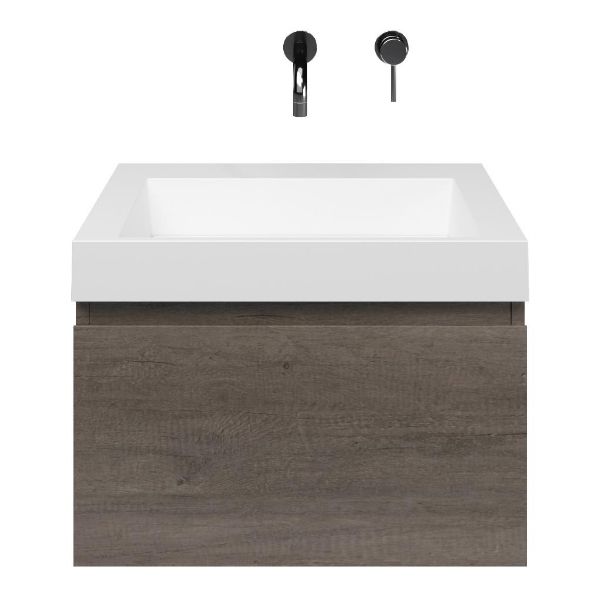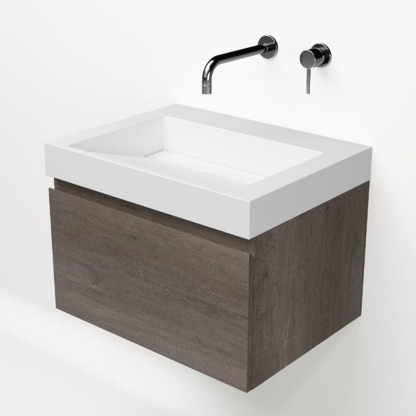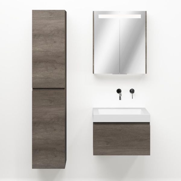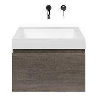 Greeploos badkamermeubel in de kleur olm donker grijs is 60 cm breed. De wastafel is vervaardig in quartz en heeft de kleur wit mat keramiek. Dit badkamermeubel met deze wastafel is leverbaar tussen de 60 cm t/m 160 cm