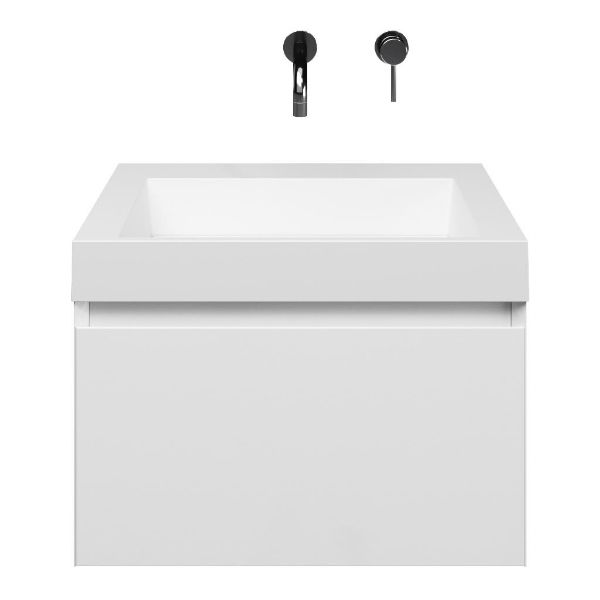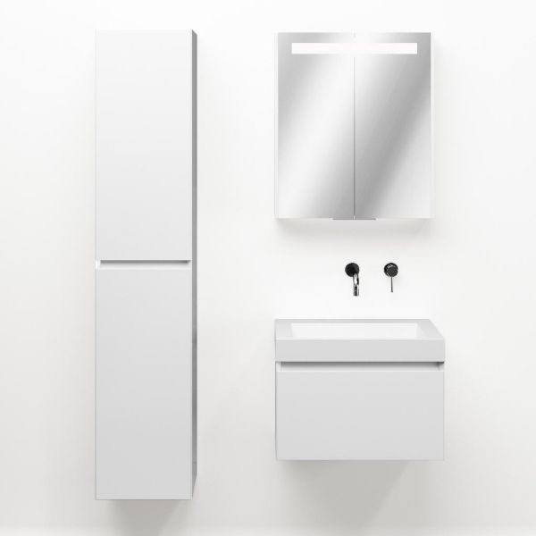 Greeploos badkamermeubel in de kleur wit hoogglans is 60 cm breed. De wastafel is vervaardig in quartz en heeft de kleur wit mat keramiek. Dit badkamermeubel met deze wastafel is leverbaar tussen de 60 cm t/m 160 cm