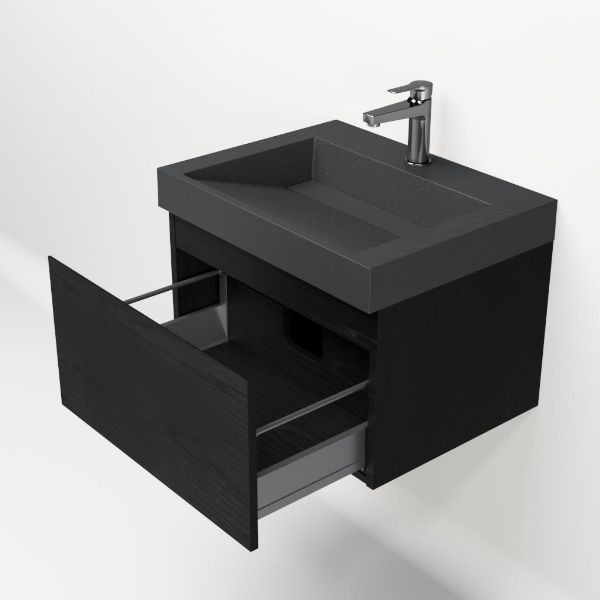 | | Bellanti Solo/Renzo-q badmeubel 60x46 1 softclose lade mat zwart eiken greeploos quartz wastafel mat grijs met 1 kraangat |