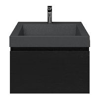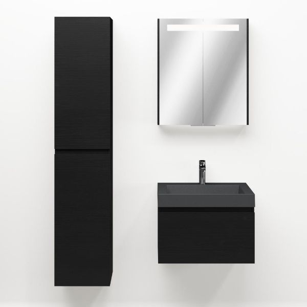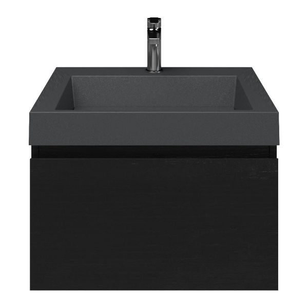 Greeploos badkamermeubel in de kleur zwart mat eiken is 60 cm breed. De wastafel is vervaardig in quartz en heeft de kleur grijs mat quartz. Dit badkamermeubel met deze wastafel is leverbaar tussen de 60 cm t/m 160 cm