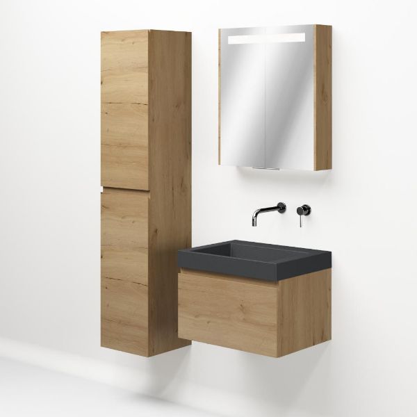 Greeploos badkamermeubel in de kleur eiken natuur is 60 cm breed. De wastafel is vervaardig in quartz en heeft de kleur grijs mat quartz. Dit badkamermeubel met deze wastafel is leverbaar tussen de 60 cm t/m 160 cm