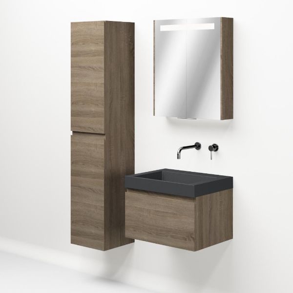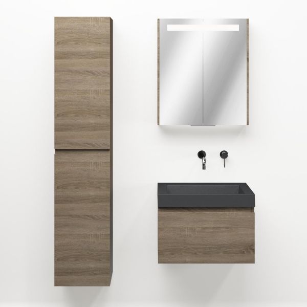 Greeploos badkamermeubel in de kleur eiken donker is 60 cm breed. De wastafel is vervaardig in quartz en heeft de kleur grijs mat quartz. Dit badkamermeubel met deze wastafel is leverbaar tussen de 60 cm t/m 160 cm