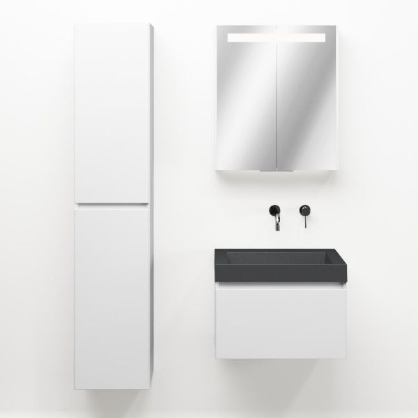 Greeploos badkamermeubel in de kleur wit mat is 60 cm breed. De wastafel is vervaardig in quartz en heeft de kleur grijs mat quartz. Dit badkamermeubel met deze wastafel is leverbaar tussen de 60 cm t/m 160 cm