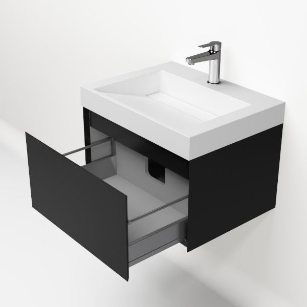 Greeploos badkamermeubel in de kleur zwart mat is 60 cm breed. De wastafel is vervaardig in quartz en heeft de kleur wit mat keramiek. Dit badkamermeubel met deze wastafel is leverbaar tussen de 60 cm t/m 160 cm
