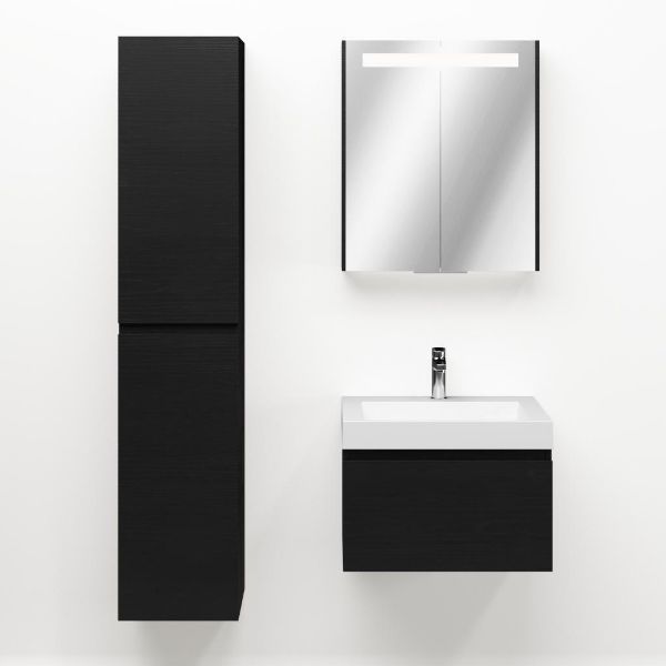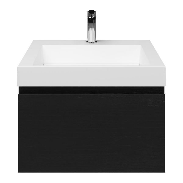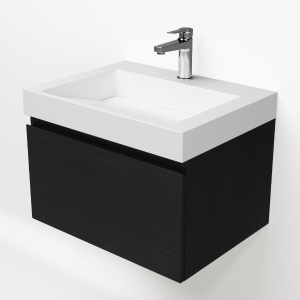 Greeploos badkamermeubel in de kleur zwart mat eiken is 60 cm breed. De wastafel is vervaardig in quartz en heeft de kleur wit mat keramiek. Dit badkamermeubel met deze wastafel is leverbaar tussen de 60 cm t/m 160 cm