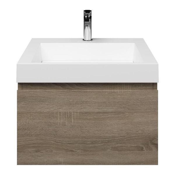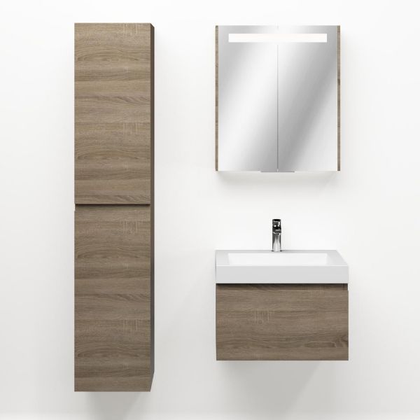 Greeploos badkamermeubel in de kleur eiken donker is 60 cm breed. De wastafel is vervaardig in quartz en heeft de kleur wit mat keramiek. Dit badkamermeubel met deze wastafel is leverbaar tussen de 60 cm t/m 160 cm