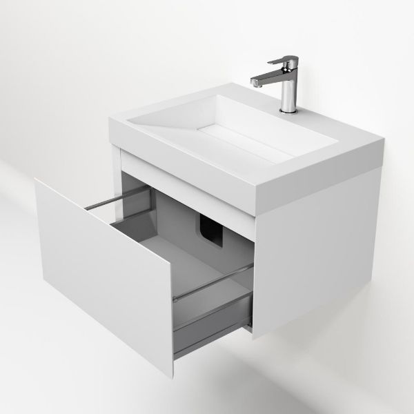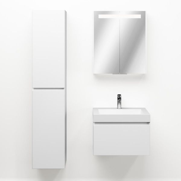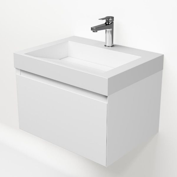 Greeploos badkamermeubel in de kleur wit mat is 60 cm breed. De wastafel is vervaardig in quartz en heeft de kleur wit mat keramiek. Dit badkamermeubel met deze wastafel is leverbaar tussen de 60 cm t/m 160 cm