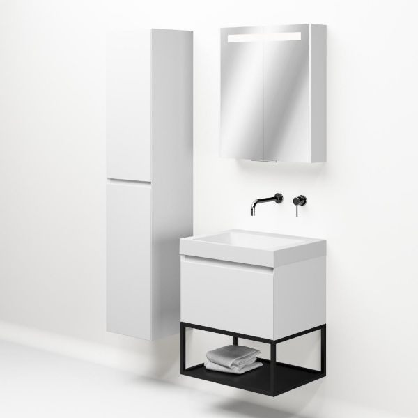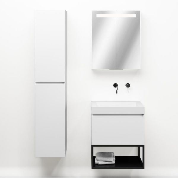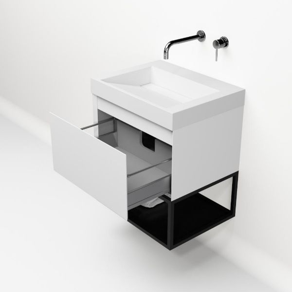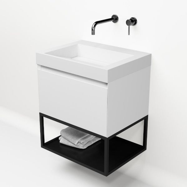 | | Bellanti Solo/Tela/Renzo badmeubel 60x46 1 softclose lade wit mat greeploos polystone wastafel wit zonder kraangaten met mat zwart metalen frame |