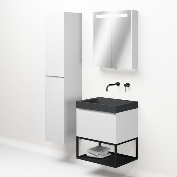 | | Bellanti Solo/Tela/Renzo-q badmeubel 60x46 1 softclose lade wit mat greeploos quartz wastafel mat grijs zonder kraangaten met mat zwart metalen frame |