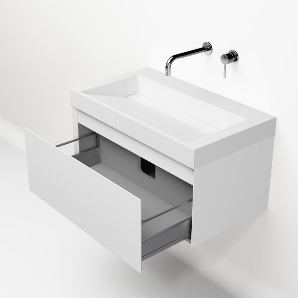 Greeploos badkamermeubel in de kleur wit mat is 80 cm breed. De wastafel is vervaardig in polystone en heeft de kleur wit. Dit badkamermeubel met deze wastafel is leverbaar tussen de 60 cm t/m 160 cm