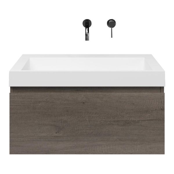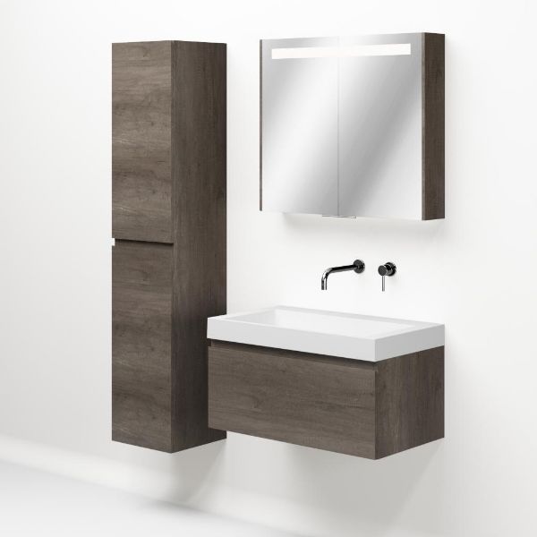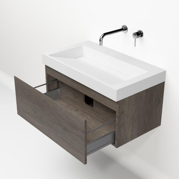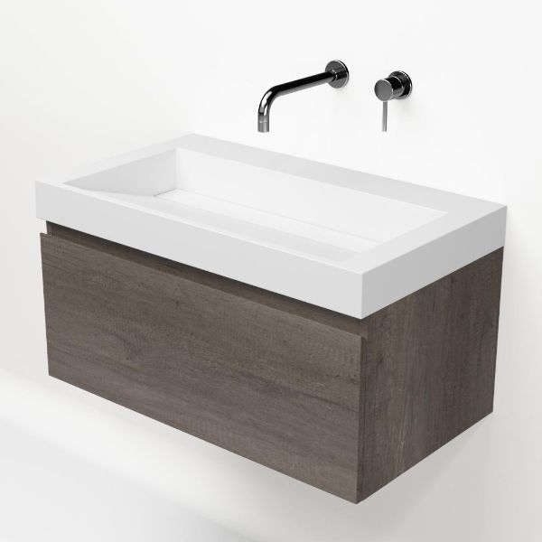 Greeploos badkamermeubel in de kleur olm donker grijs is 80 cm breed. De wastafel is vervaardig in polystone en heeft de kleur wit. Dit badkamermeubel met deze wastafel is leverbaar tussen de 60 cm t/m 160 cm