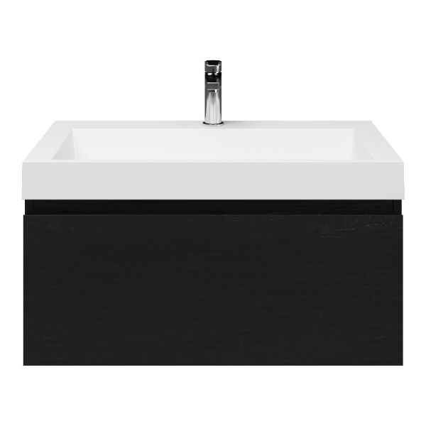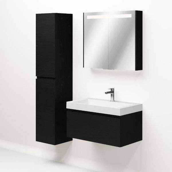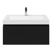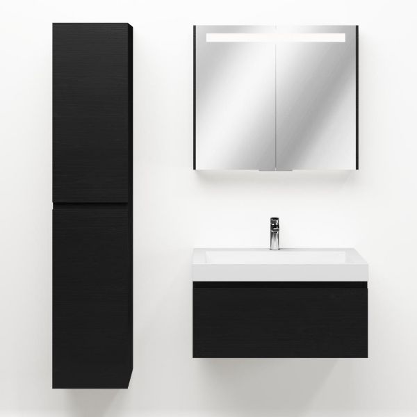 Greeploos badkamermeubel in de kleur zwart mat eiken is 80 cm breed. De wastafel is vervaardig in polystone en heeft de kleur wit. Dit badkamermeubel met deze wastafel is leverbaar tussen de 60 cm t/m 160 cm