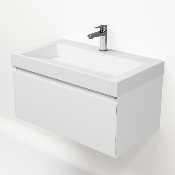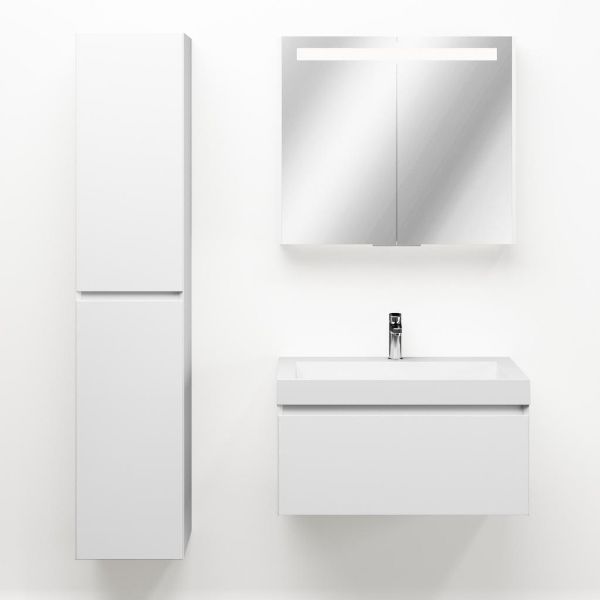 Greeploos badkamermeubel in de kleur wit mat is 80 cm breed. De wastafel is vervaardig in polystone en heeft de kleur wit. Dit badkamermeubel met deze wastafel is leverbaar tussen de 60 cm t/m 160 cm