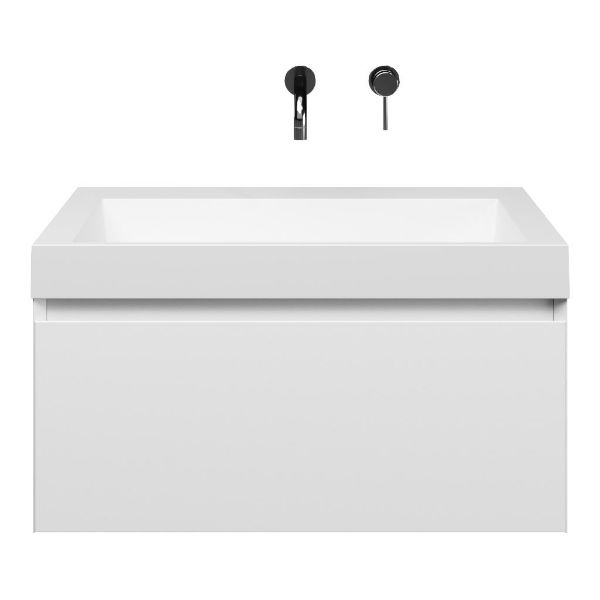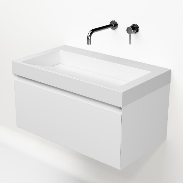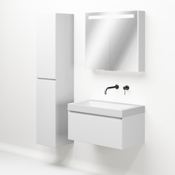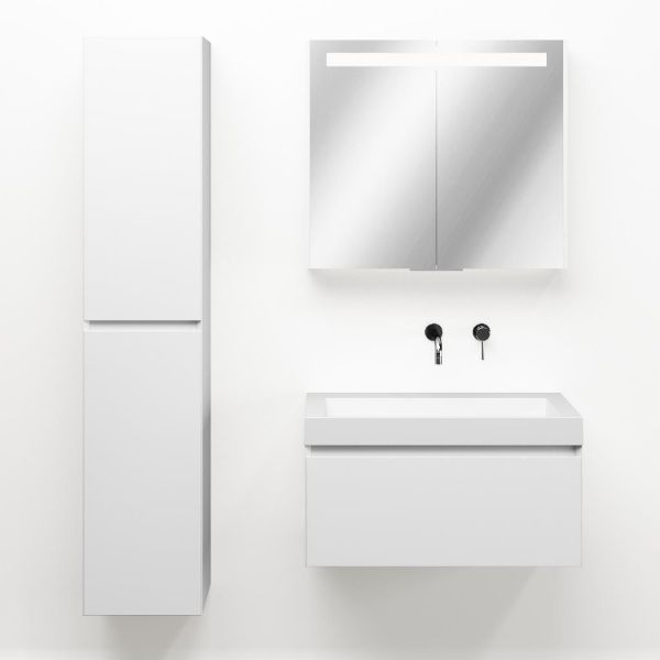 Greeploos badkamermeubel in de kleur wit mat is 80 cm breed. De wastafel is vervaardig in quartz en heeft de kleur wit mat keramiek. Dit badkamermeubel met deze wastafel is leverbaar tussen de 60 cm t/m 160 cm