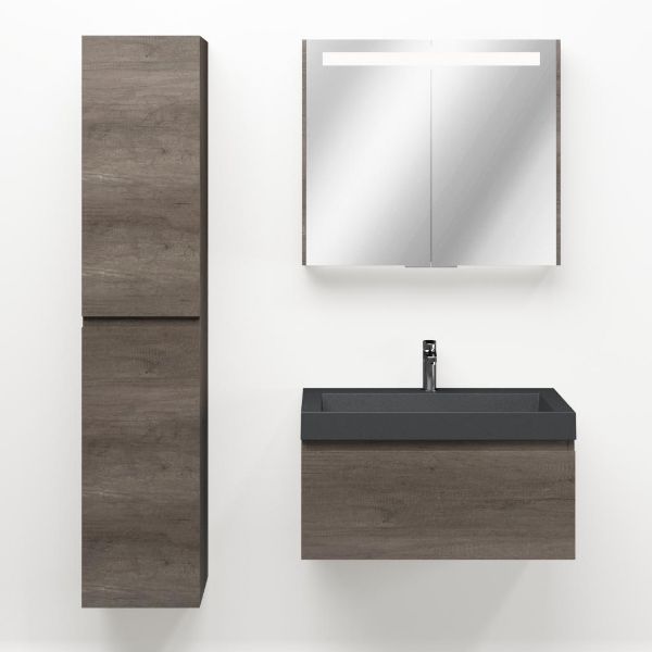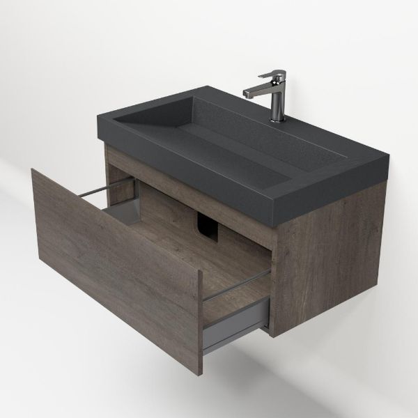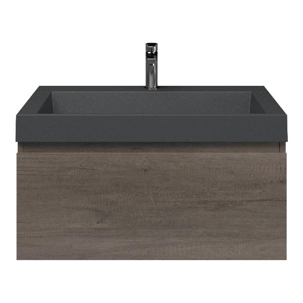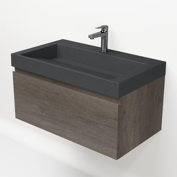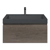 Greeploos badkamermeubel in de kleur olm donker grijs is 80 cm breed. De wastafel is vervaardig in quartz en heeft de kleur grijs mat quartz. Dit badkamermeubel met deze wastafel is leverbaar tussen de 60 cm t/m 160 cm