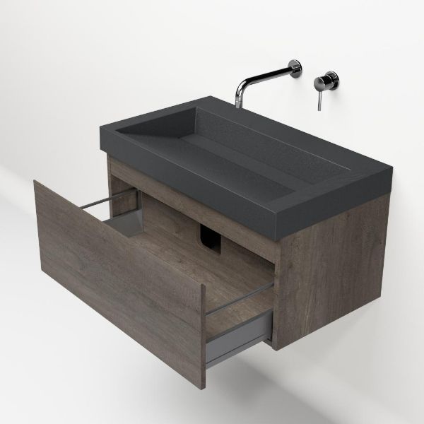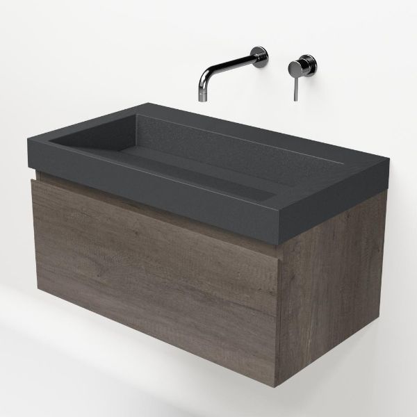 Greeploos badkamermeubel in de kleur olm donker grijs is 80 cm breed. De wastafel is vervaardig in quartz en heeft de kleur grijs mat quartz. Dit badkamermeubel met deze wastafel is leverbaar tussen de 60 cm t/m 160 cm