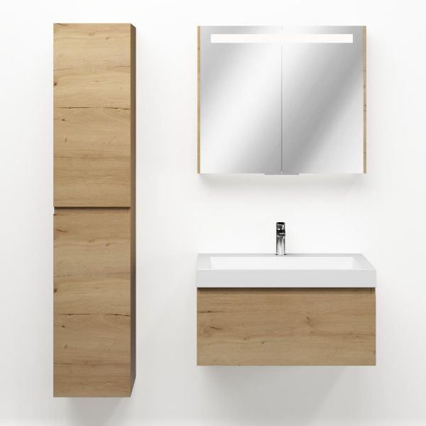 Greeploos badkamermeubel in de kleur eiken natuur is 80 cm breed. De wastafel is vervaardig in quartz en heeft de kleur wit mat keramiek. Dit badkamermeubel met deze wastafel is leverbaar tussen de 60 cm t/m 160 cm