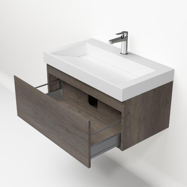 Greeploos badkamermeubel in de kleur olm donker grijs is 80 cm breed. De wastafel is vervaardig in quartz en heeft de kleur wit mat keramiek. Dit badkamermeubel met deze wastafel is leverbaar tussen de 60 cm t/m 160 cm