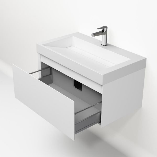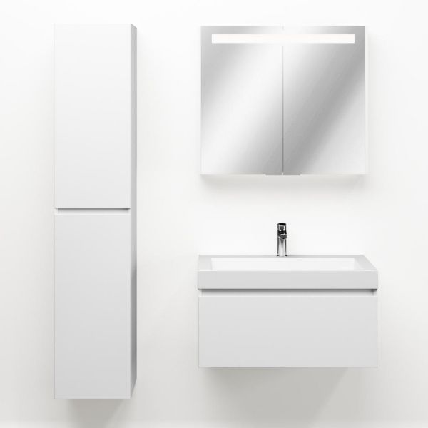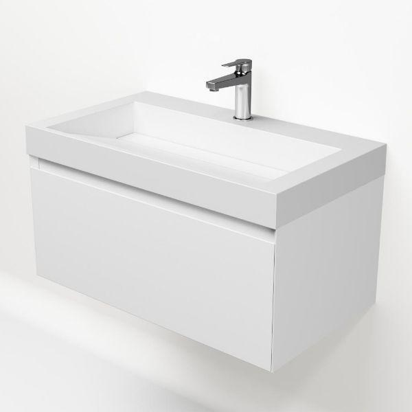 Greeploos badkamermeubel in de kleur wit mat is 80 cm breed. De wastafel is vervaardig in quartz en heeft de kleur wit mat keramiek. Dit badkamermeubel met deze wastafel is leverbaar tussen de 60 cm t/m 160 cm