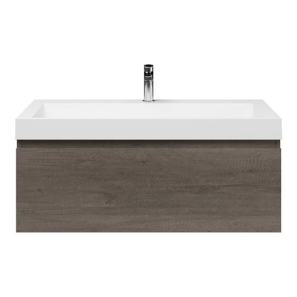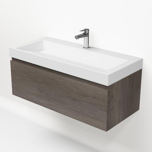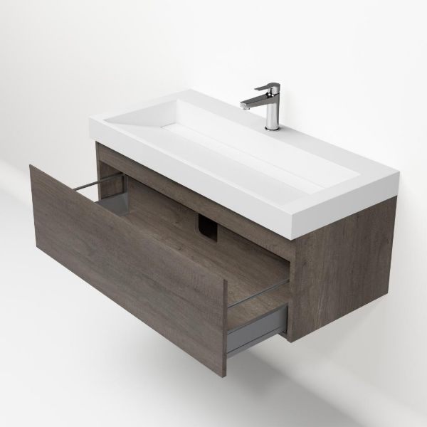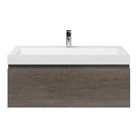Greeploos badkamermeubel in de kleur olm donker grijs is 100 cm breed. De wastafel is vervaardig in polystone en heeft de kleur wit. Dit badkamermeubel met deze wastafel is leverbaar tussen de 60 cm t/m 160 cm
