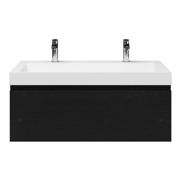 Greeploos badkamermeubel in de kleur zwart mat eiken is 100 cm breed. De wastafel is vervaardig in polystone en heeft de kleur wit. Dit badkamermeubel met deze wastafel is leverbaar tussen de 60 cm t/m 160 cm