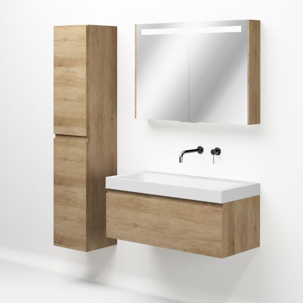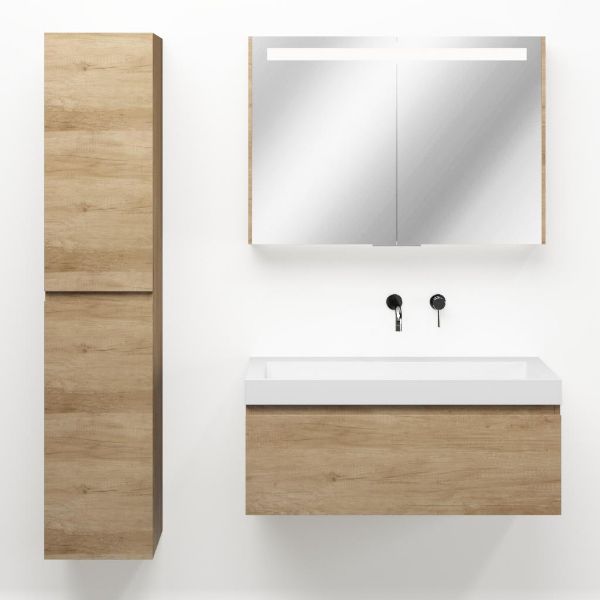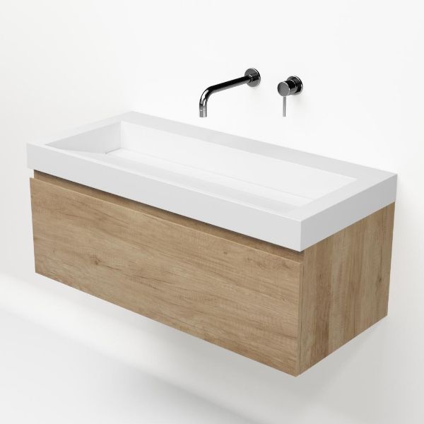 Greeploos badkamermeubel in de kleur olm is 100 cm breed. De wastafel is vervaardig in polystone en heeft de kleur wit. Dit badkamermeubel met deze wastafel is leverbaar tussen de 60 cm t/m 160 cm