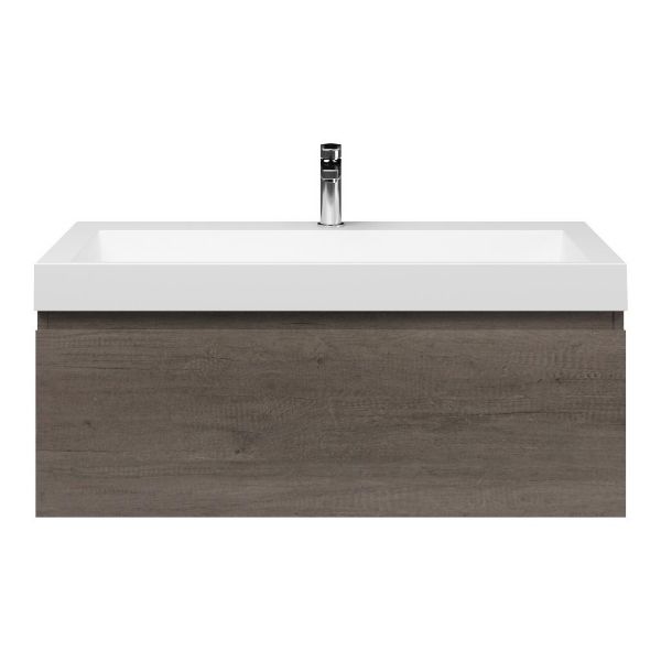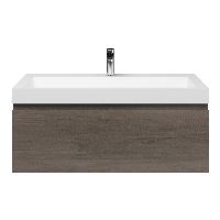 Greeploos badkamermeubel in de kleur olm donker grijs is 100 cm breed. De wastafel is vervaardig in quartz en heeft de kleur wit mat keramiek. Dit badkamermeubel met deze wastafel is leverbaar tussen de 60 cm t/m 160 cm