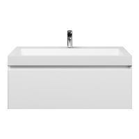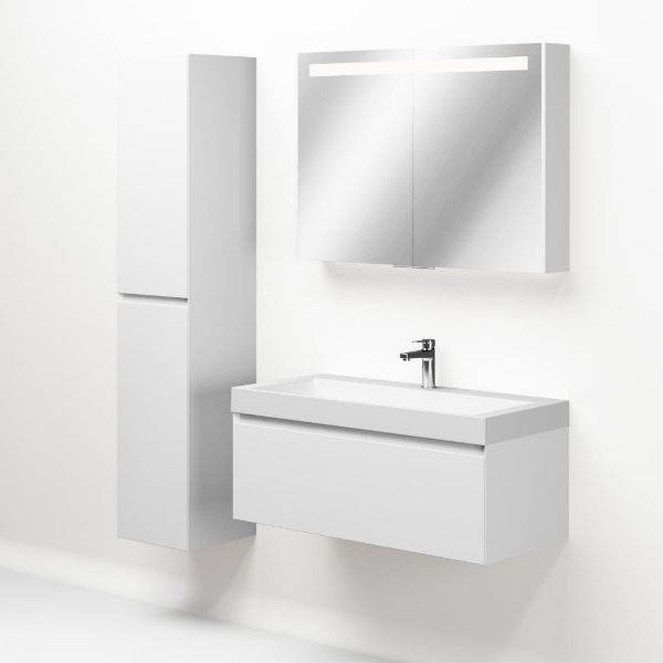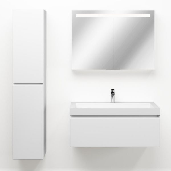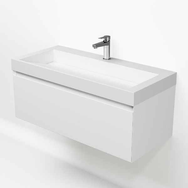 Greeploos badkamermeubel in de kleur wit mat is 100 cm breed. De wastafel is vervaardig in quartz en heeft de kleur wit mat keramiek. Dit badkamermeubel met deze wastafel is leverbaar tussen de 60 cm t/m 160 cm