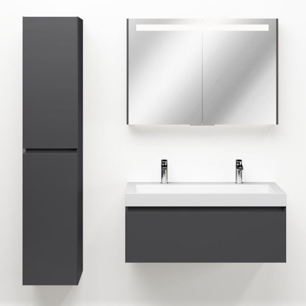 Greeploos badkamermeubel in de kleur antraciet mat is 100 cm breed. De wastafel is vervaardig in quartz en heeft de kleur wit mat keramiek. Dit badkamermeubel met deze wastafel is leverbaar tussen de 60 cm t/m 160 cm