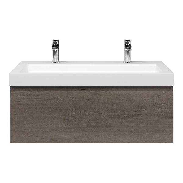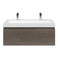 Greeploos badkamermeubel in de kleur olm donker grijs is 100 cm breed. De wastafel is vervaardig in quartz en heeft de kleur wit mat keramiek. Dit badkamermeubel met deze wastafel is leverbaar tussen de 60 cm t/m 160 cm