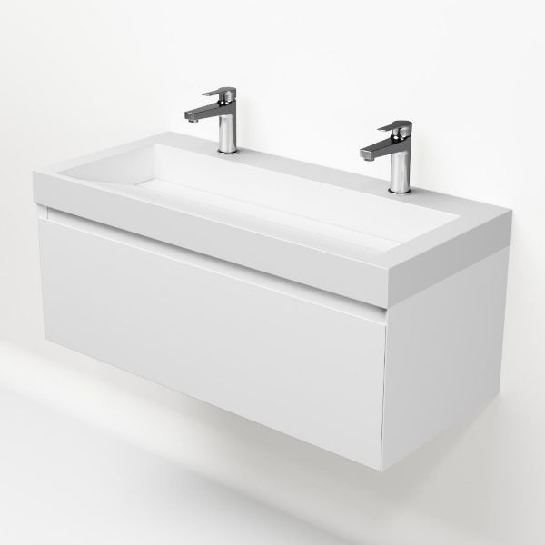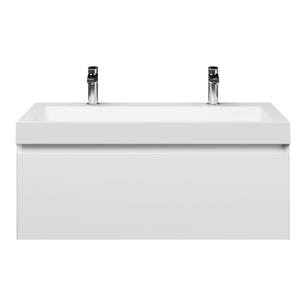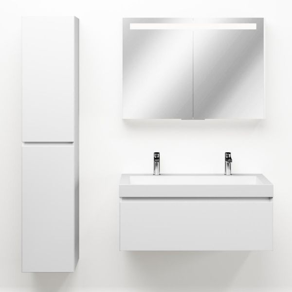 Greeploos badkamermeubel in de kleur wit mat is 100 cm breed. De wastafel is vervaardig in quartz en heeft de kleur wit mat keramiek. Dit badkamermeubel met deze wastafel is leverbaar tussen de 60 cm t/m 160 cm