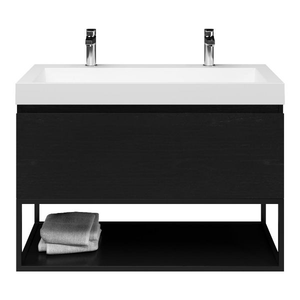 | Bellanti Solo/Tela/Renzo-q badmeubel 100x46 1 softclose lade mat zwart eiken greeploos quartz wastafel mat wit met 2 kraangaten met mat zwart metalen frame |