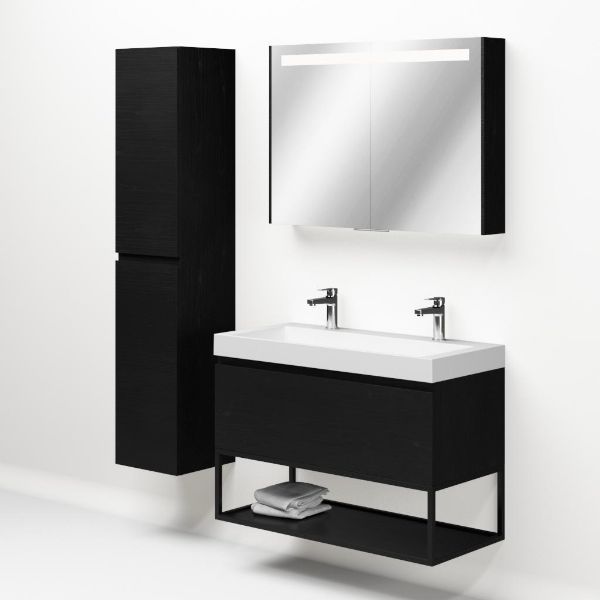 Greeploos badkamermeubel in de kleur zwart mat eiken is 100 cm breed. De wastafel is vervaardig in quartz en heeft de kleur wit mat keramiek. Dit badkamermeubel met deze wastafel is leverbaar tussen de 60 cm t/m 160 cm