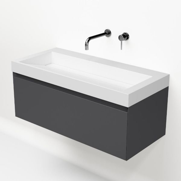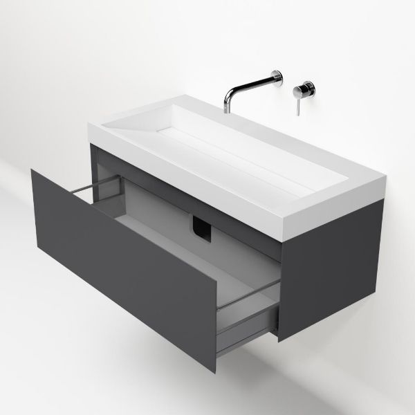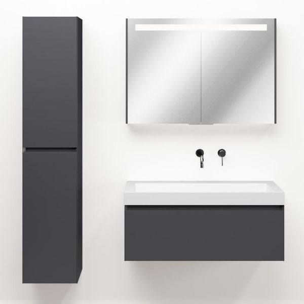 Greeploos badkamermeubel in de kleur antraciet mat is 100 cm breed. De wastafel is vervaardig in quartz en heeft de kleur wit mat keramiek. Dit badkamermeubel met deze wastafel is leverbaar tussen de 60 cm t/m 160 cm