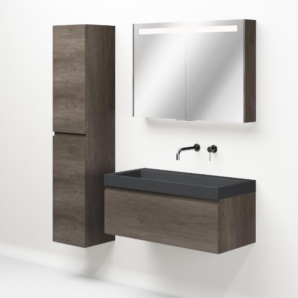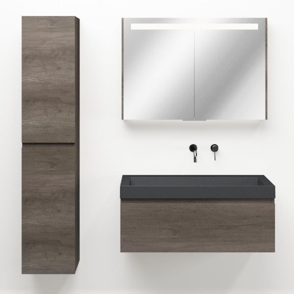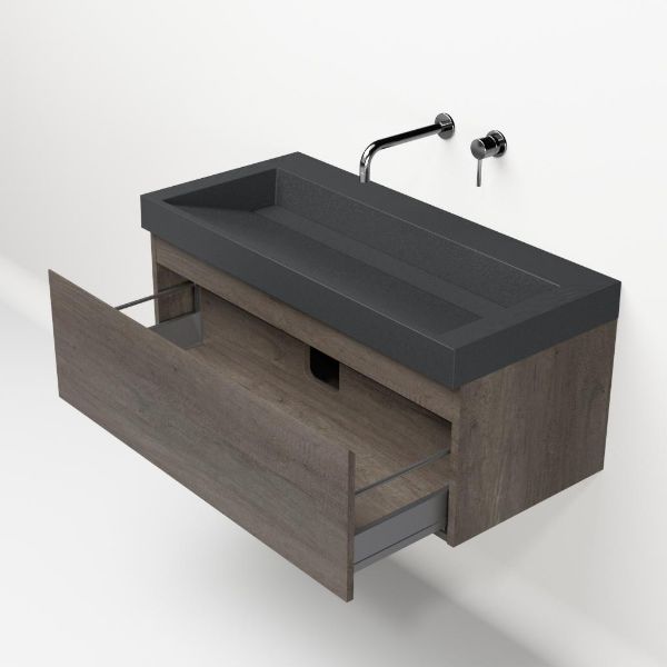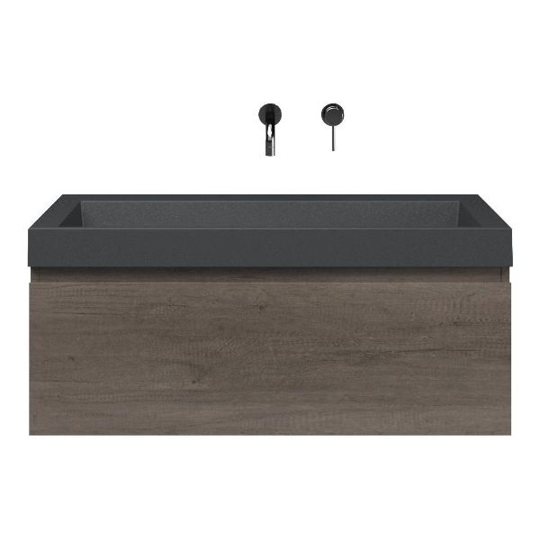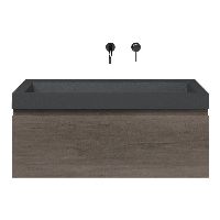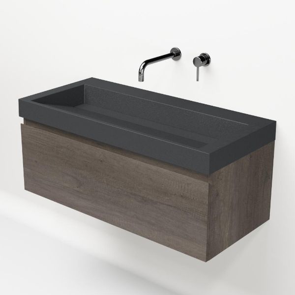 Greeploos badkamermeubel in de kleur olm donker grijs is 100 cm breed. De wastafel is vervaardig in quartz en heeft de kleur grijs mat quartz. Dit badkamermeubel met deze wastafel is leverbaar tussen de 60 cm t/m 160 cm