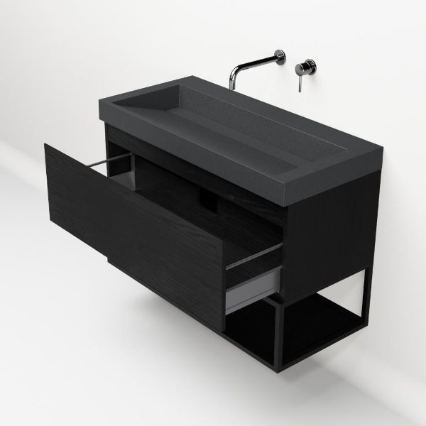 | | Bellanti Solo/Tela/Renzo-q badmeubel 100x46 1 softclose lade mat zwart eiken greeploos quartz wastafel mat grijs zonder kraangaten met mat zwart metalen frame |