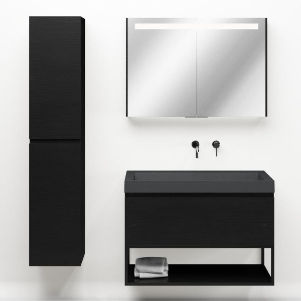 Greeploos badkamermeubel in de kleur zwart mat eiken is 100 cm breed. De wastafel is vervaardig in quartz en heeft de kleur grijs mat quartz. Dit badkamermeubel met deze wastafel is leverbaar tussen de 60 cm t/m 160 cm