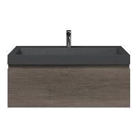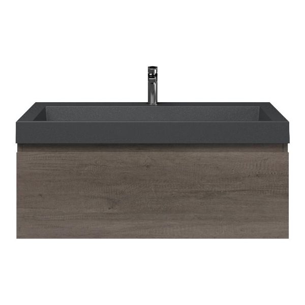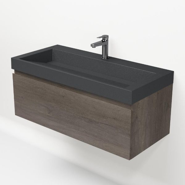 Greeploos badkamermeubel in de kleur olm donker grijs is 100 cm breed. De wastafel is vervaardig in quartz en heeft de kleur grijs mat quartz. Dit badkamermeubel met deze wastafel is leverbaar tussen de 60 cm t/m 160 cm