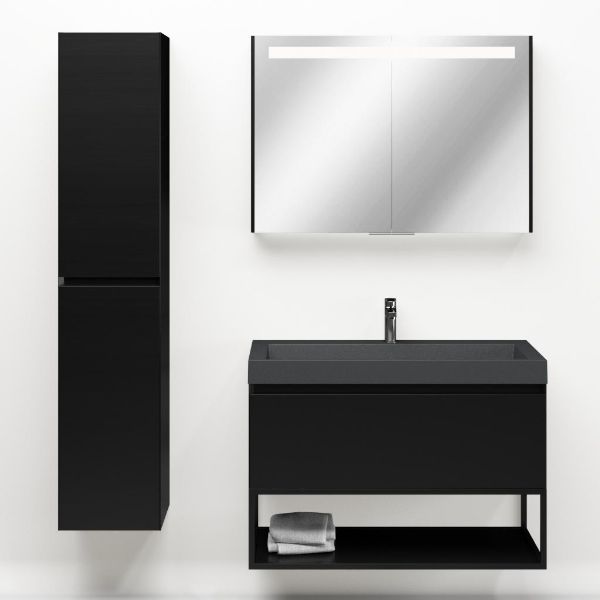 Greeploos badkamermeubel in de kleur zwart mat is 100 cm breed. De wastafel is vervaardig in quartz en heeft de kleur grijs mat quartz. Dit badkamermeubel met deze wastafel is leverbaar tussen de 60 cm t/m 160 cm