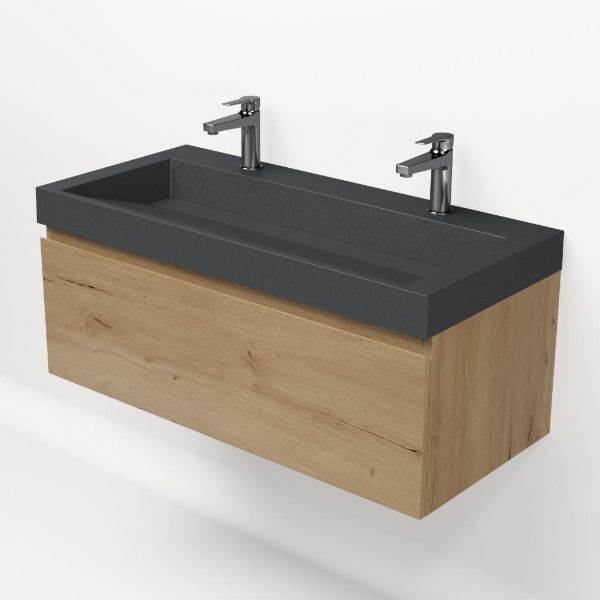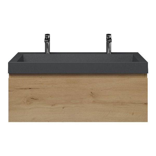 | | Bellanti Solo/Renzo-q badmeubel 100x46 1 softclose lade eiken natuur greeploos quartz wastafel mat grijs met 2 kraangaten |