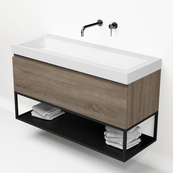 | | Bellanti Solo/Tela/Renzo badmeubel 120x46 1 softclose lade eiken donker greeploos polystone wastafel wit zonder kraangaten met mat zwart metalen frame |