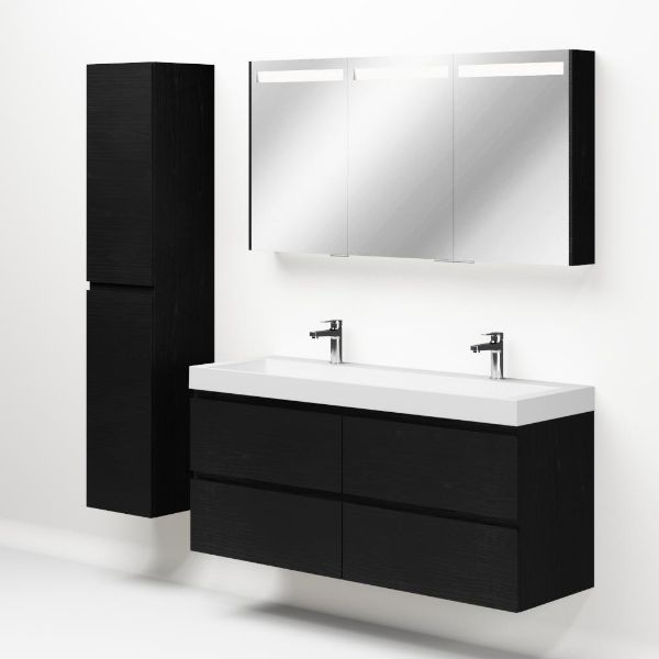 Greeploos badkamermeubel in de kleur zwart mat eiken is 140 cm breed. De wastafel is vervaardig in polystone en heeft de kleur wit. Dit badkamermeubel met deze wastafel is leverbaar tussen de 60 cm t/m 140 cm