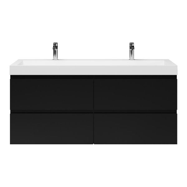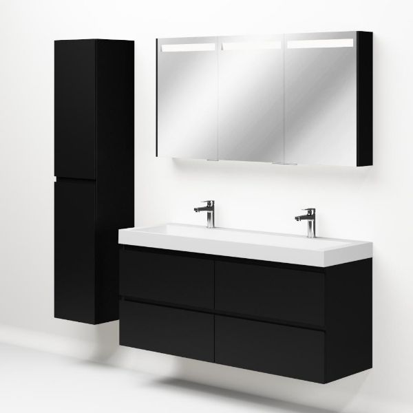 Greeploos badkamermeubel in de kleur zwart mat is 140 cm breed. De wastafel is vervaardig in polystone en heeft de kleur wit. Dit badkamermeubel met deze wastafel is leverbaar tussen de 60 cm t/m 140 cm