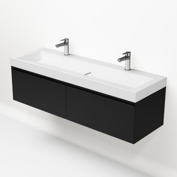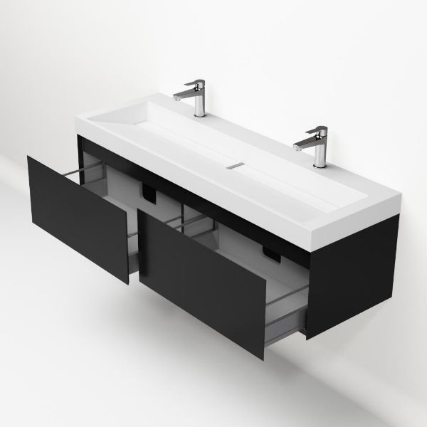 Greeploos badkamermeubel in de kleur zwart mat is 140 cm breed. De wastafel is vervaardig in polystone en heeft de kleur wit. Dit badkamermeubel met deze wastafel is leverbaar tussen de 60 cm t/m 160 cm